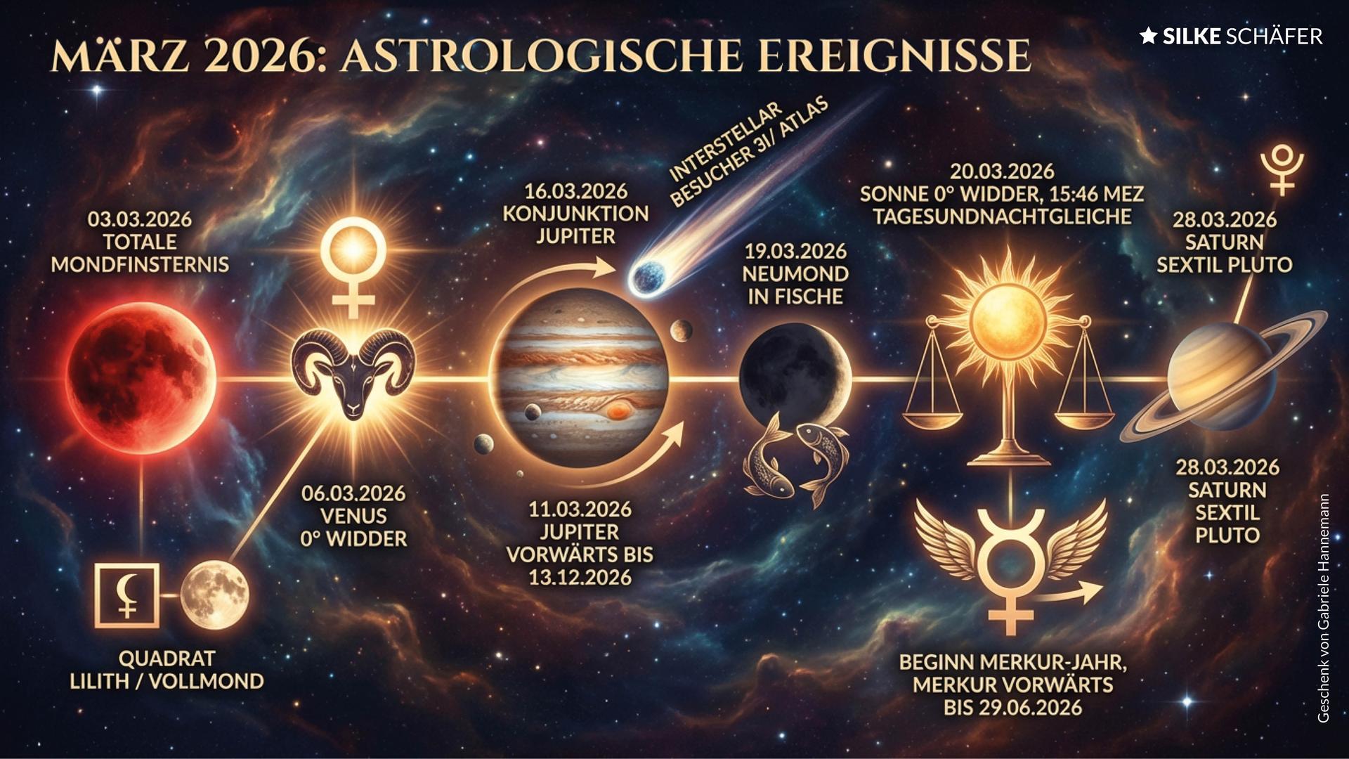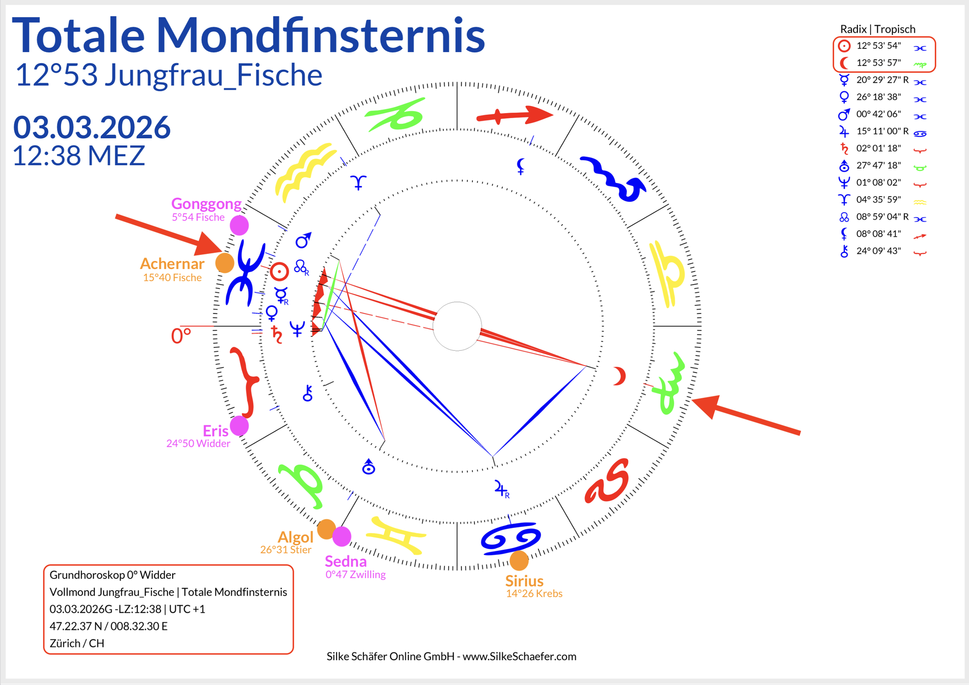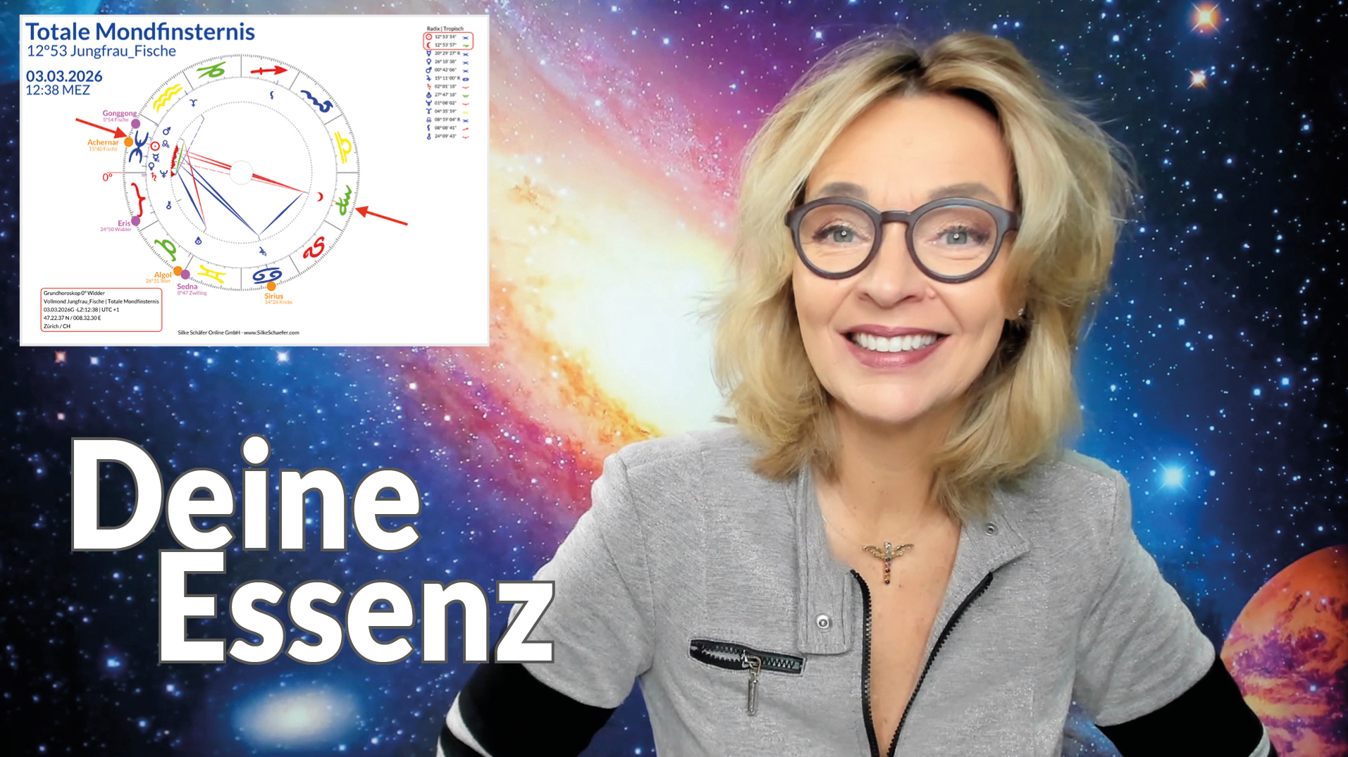 In dieser Finsternis zeigt der aufsteigende Mondknoten (Zukunft) auf die Sonne in Fische und der absteigende Mondknoten (Vergangenheit) auf den verdunkelten Mond im Zeichen Jungfrau. Dies wird begleitet durch eine schöne Konstellation mit dem Glücksplanet Jupiter, der wiederum in einer Lichtlinie mit dem Fixstern Sirius wirkt. Und gleichzeitig wirkt Uranus mit dem Fixstern Algol, der auch der "Dämonenstern" genannt wird. Diese Spannung ist und bleibt herausfordernd.