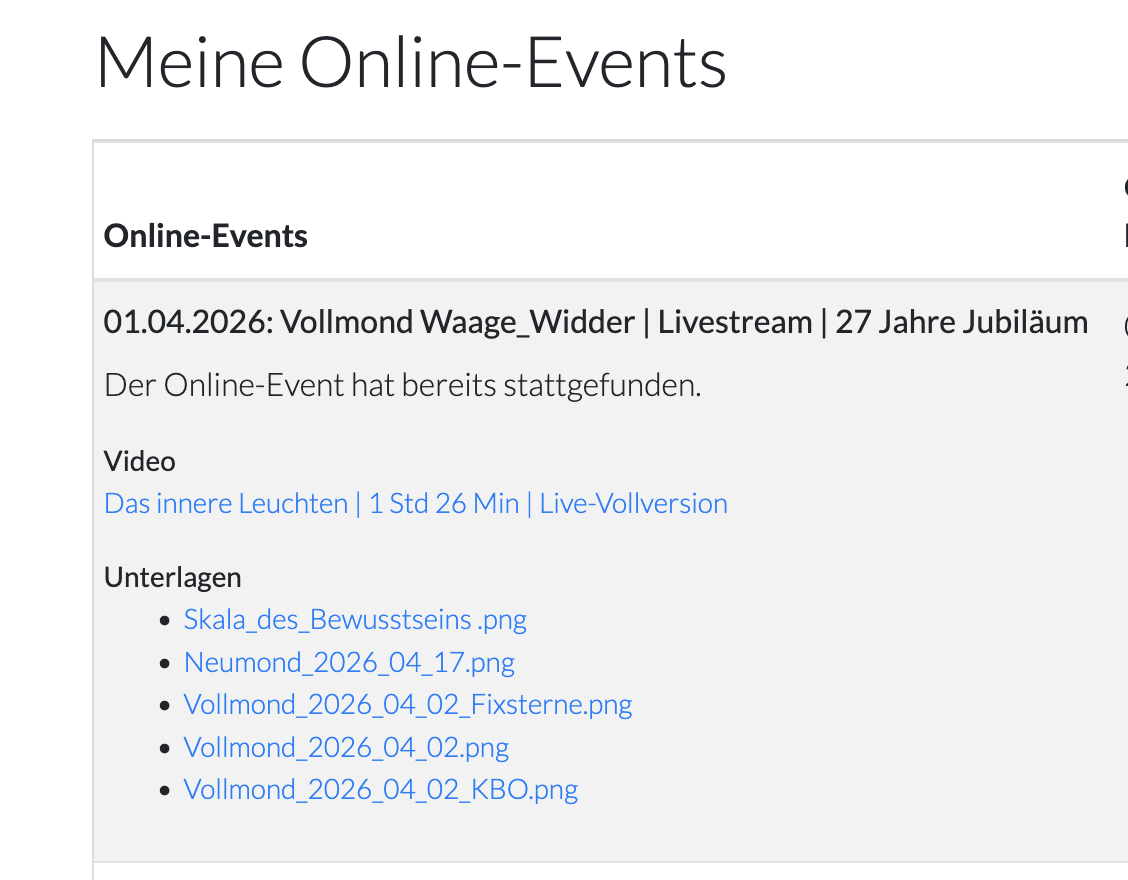 Allen Teilnehmenden mit einem gültigen Ticket wurden der Link zur Aufzeichnung (Vortrag & Meditation) sowie die Unterlagen im Anschluss an den Livestream um 21:50 Uhr zugestellt.