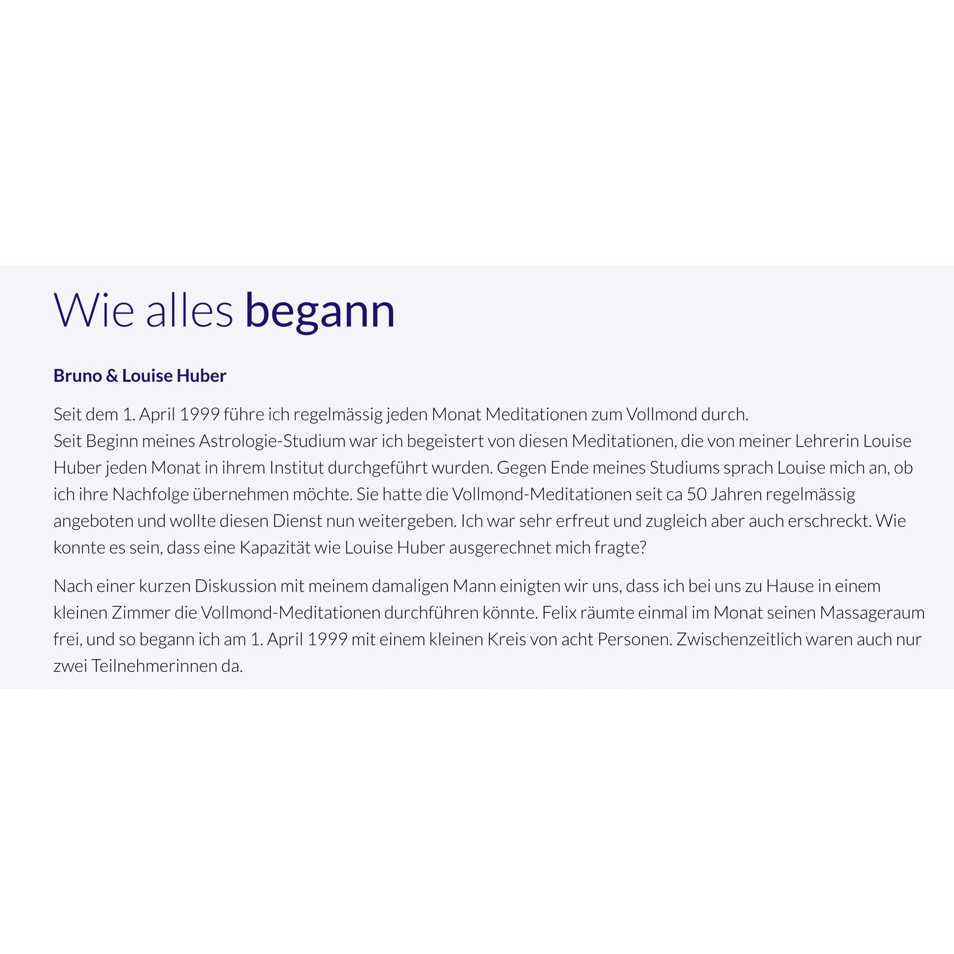 Es ist tatsächlich 27 Jahre her, als ich mit den Meditationen zum Vollmond begann. Im April 1999 habe ich von Louise Huber diese ehrenvolle Aufgabe übertragen bekommen. Ich startete damals in einem kleinen Zimmer zur viert. Hieraus ist unterdessen eine weltweite Bewegung mit Tausenden von Menschen geworden. Es hat sich einfach so entwickelt. Seit 27 Jahren bin ich jeden Monat immer da. Jeden Monat. Nur 3x musste ausfallen lassen.